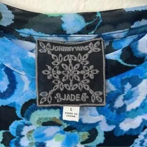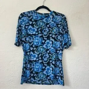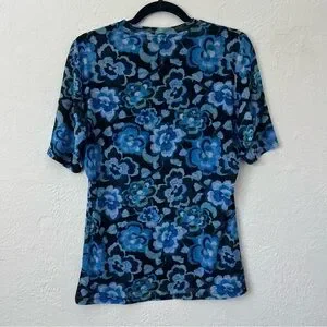 Johnny Was Blue Calanthe Mesh Top Allover Floral Print Stretchy Lg