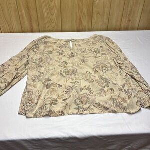 This cream-colored blouse from Maurices features a relaxed fit with billowy sleeves that gather at the cuffs, offering a comfortable yet stylish look. The soft fabric and subtle floral print add a touch of elegance, making it a versatile addition to any wardrobe.