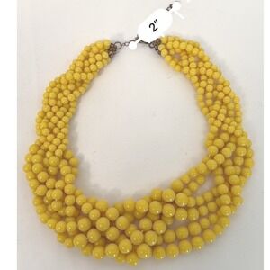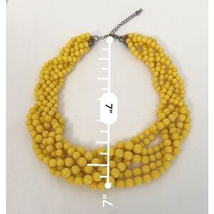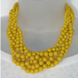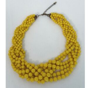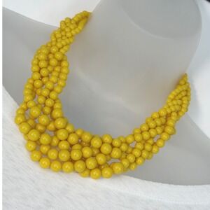Vibrant yellow multi-strand beaded statement necklace features a bold, layered bib design with polished round beads. The tiered construction creates a voluminous look, perfect for adding a pop of color to any outfit. It is finished with an antiqued brass-tone lobster claw clasp and an adjustable extender chain for a customizable fit.