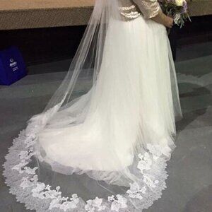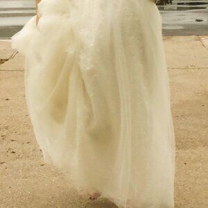 Beautiful romantic strapless wedding gown in a classic A-line silhouette. Features a lace appliqué/embroidered bodice with a straight (slightly sweetheart-looking) neckline and structured fit through the bust. The skirt is full and flowy with a soft tulle overlay and lace detailing that continues down the front for an elegant, timeless look. Floor-length with a light, airy drape—perfect for indoor or outdoor weddings.