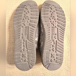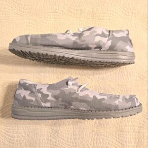 Stylish Hey Dude shoes with a gray camo pattern. Comfortable and trendy design. Perfect for casual wear.