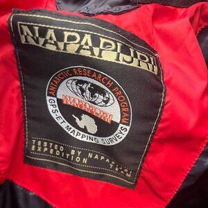 Very fun and retro Napapijri ski jacket in a stunning shade of red. Super warm! Features include a removable hood, gorgeous patches, metal zippers. Deluxe! Sadly, no longer fits. Size small.