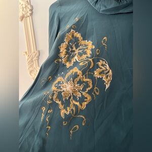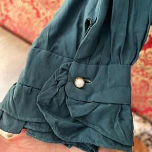 This is a vintage item from Italy. It measures pit to pit 19 inches flat. Shoulder to hem around 23 inches. Shoulder to shoulder is 16 inches. I think the fabric is silk. Two vintage buttons at ruffled cuffs. Ruffled collar with tie neck. Unique and beautiful, would best fit size S/M.