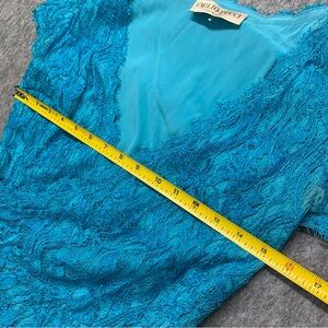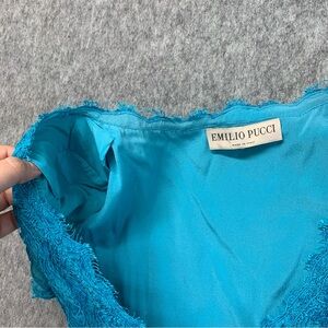 Stunning blue lace top by Emilio Pucci. Features intricate lace detailing. Ideal for elegant occasions.