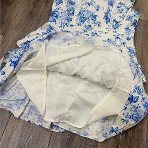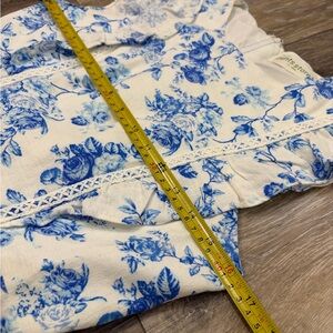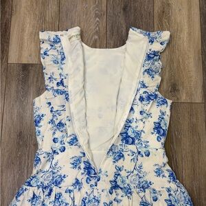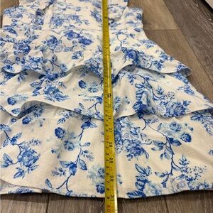 Linen white mini dress with blue floral print. Features ruffled sleeves and tiered skirt. Perfect for Spring and Easter!