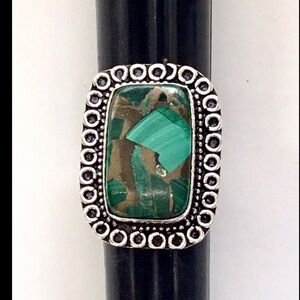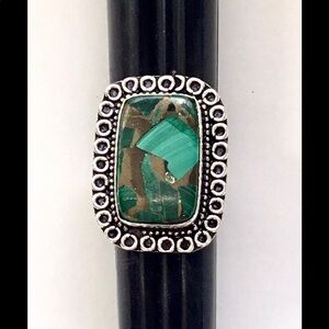 Dramatic Square Cut Copper and Malachite Gemstone ring. Stone alone is approx., 3/4”H x 1/2”W. The ring is just over 1”H x 7/8”W. Handmade by artisans. 925 Sterling silver over alloy. Offers considered.