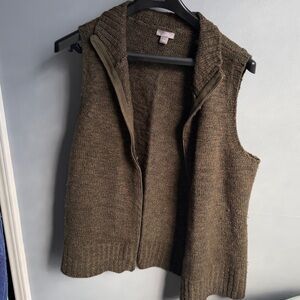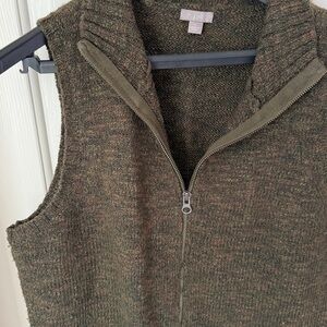 Stylish brown and green sleeveless sweater vest with a zip-up front. Perfect for layering.