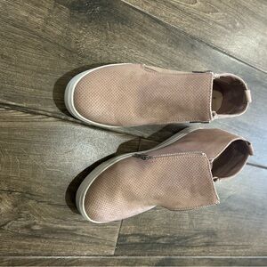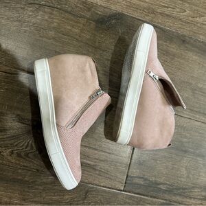 Stylish pink slip-on sneakers with a perforated design. Features a convenient side zipper.