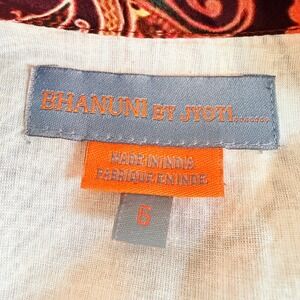 Bhanuni by Jyoti Anthropologie maxi dress features a vibrant, multi-color paisley and floral print across a flowing viscose silhouette. Intricate sequin and beaded embroidery accents the deep V-neckline, complemented by a decorative banded waist and long sleeves. This bohemian-inspired piece offers a sophisticated aesthetic with its rich earth tones and detailed patterns.