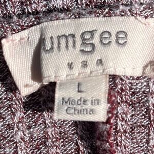 This Umgee tunic top in size Large features a unique design with long sleeves, a round neckline, and a relaxed fit. The top is made of a rib knit fabric with peek-a-boo lace detailing at the bottom, adding a touch of femininity to the piece. The wine color adds a rich and elegant look to the tunic, which is perfect for casual or dressed-up occasions. The top is a stylish addition to any woman's wardrobe. Large measures approximately 21” pit to pit and 30” length