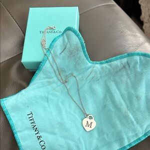Chic necklace with a silver heart pendant featuring an initial M. Ideal for personal style and comes with box and shine glove