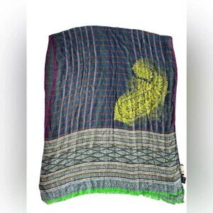 Beautiful colors and design with neon green raw edges. Excellent condition. Light airy feel.