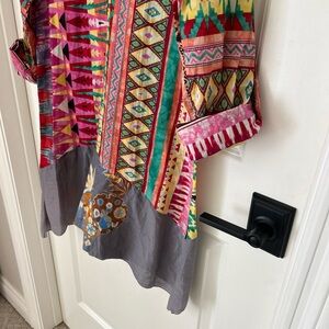 Bright tunic with geometric and floral patterns. Features vibrant colors and a relaxed fit. Ideal for a bold fashion Offered in excellent preowned condition.