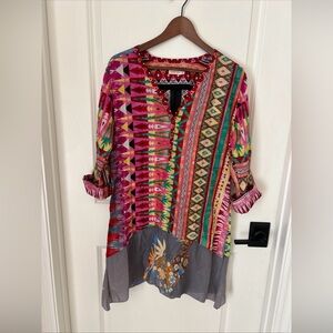 JOHNNY WAS Colorful Mixed Media Roll Tab Sleeve Lightweight Tunic Top Sz S