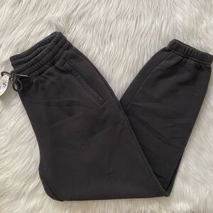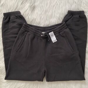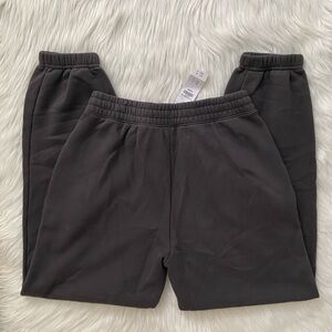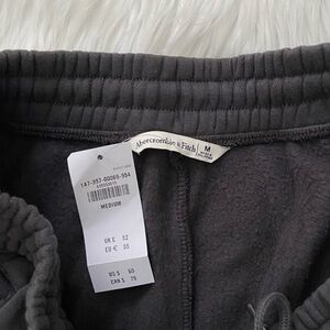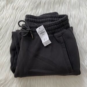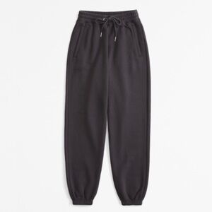 high rise sweatpants in heavyweight soft a&f max fleece fabric, featuring relaxed sunday silhouette, an elasticated waistband, exterior drawcords with metal aglets, pockets and banded cuffs. slight natural color variations may appear in certain lighting as shown in photo 12— this is part of the dye process, not stains. size medium. color: dark gray.