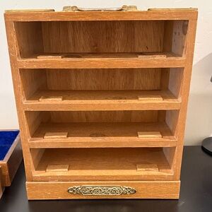 Elegant vintage wooden jewelry storage with 4 drawers with handles. It does have some scuffs on it as you can tell from the pictures but is heavy and well made.