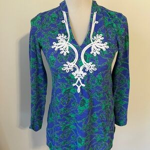 Bold multicolor quilt-inspired patchwork print with paisley, geometric, and floral patterns throughout. Adjustable button straps and wide leg silhouette. Functional side pockets.