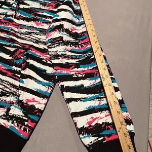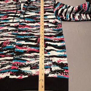 Vibrant hoodie with abstract patterns. Features a mix of pink, blue, and black colors. Perfect for a bold look.