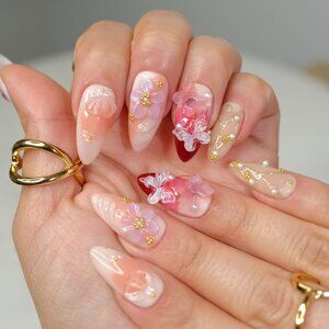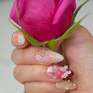 Sip in style and let your nails do the talking with Rosè All Day. Inspired by the elegance of blooming florals, the charm of delicate pearls, and the whimsy of fluttering butterflies, this handmade press-on nail set is your perfect accessory for any occasion. This elegant design features soft pink hues adorned with floral accents, pearls, and butterfly details for a dreamy, romantic look.