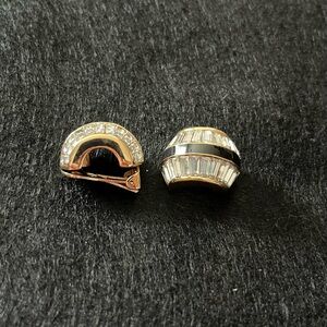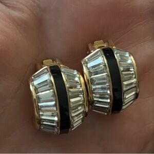 These Swarovski channel set baguette crystals in gold plated clip-on earrings are absolutely gorgeous!! They feature clear baguette crystals which really catch the light and look like real diamonds. They're set in a gold plated crescent setting with perfect clip-on mechanisms. They have black lacquer highlights adding more drama to these exquisite pieces. They're in excellent vintage condition & signed!.