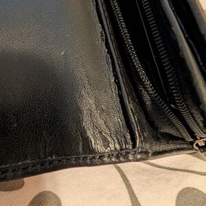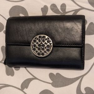 This is the Alexandra Signature Slim Envelope Wallet by COACH. Soft crossgrain Leather in Solid Black. Features a beautiful Silver Medallion with a fun design of the signature C Coach logo. Zippered pocket on the back of the exterior. The tri-fold interior opens via snap clasp below the medallion. Lots of organization options inside! 3 full-length bill slots, and 12 card slots. Signature Coach logo engraved in the leather on the bottom right. Overall the wallet is in very good condition however there is damage from storage. The leather in the two main creases is cracked and peeling (see photos for details).