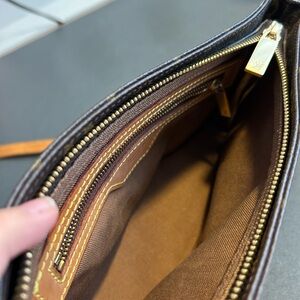 Stylish shoulder bag with iconic monogram pattern. Features adjustable strap. Ideal for everyday elegance. In Excellent Condition