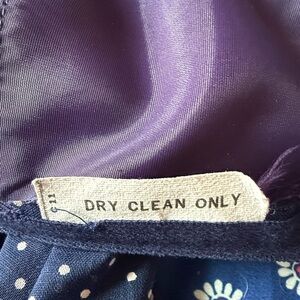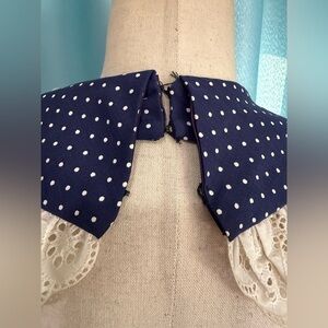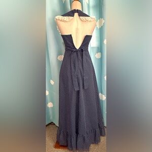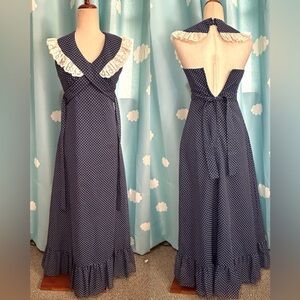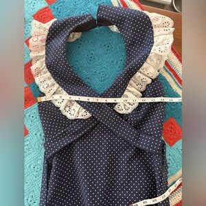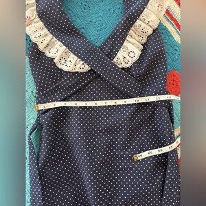 Vintage navy prairie dress with cross cross lace and sash. Small polka dots. Fabric is like a taffeta. Fully lined. Only tag is do not dry clean. Size XXS. See measurements in photos. About 56" long from back top halter collar.