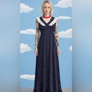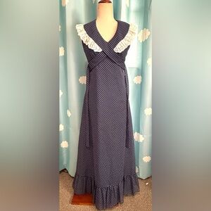 Vintage prairie dress- polka dot navy ruffle, lace cross tie maxi- XXS