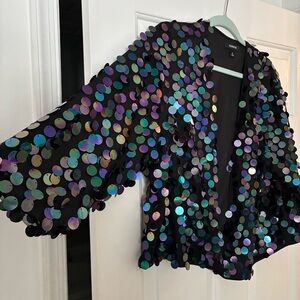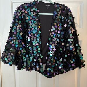 Dazzle with this lightweight cover up. Features iridescent sequins for a bold look. Ideal for evening wear. Please look closely at photos. Some of the sequins have some wear but in excellent shape other wise!