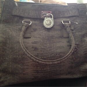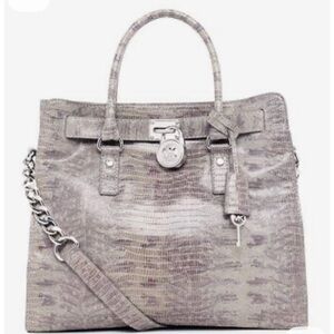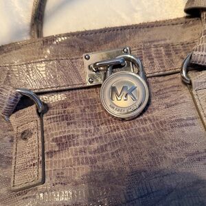 Stylish Michael Kors satchel with crocodile texture. Features a sleek silver tone. Perfect for any outfit.