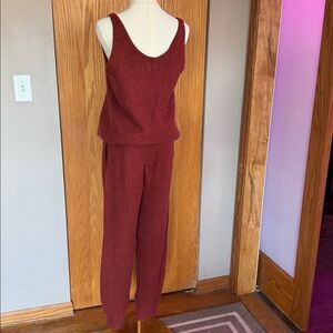2 pc Universal Thread lounge set is NWOT! Yummy rib knit soft sweater material. Jogger style pants with elastic/drawstring waist and nice deep pockets. Size Large. Matching knit henley styled 5-snap tank is an oversized Medium. Color is rust. Nice enough to wear out to lunch, comfy enough to wear on the couch.
