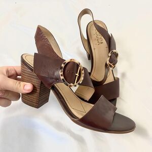 Rich chocolate brown leather heels featuring wide crossover straps and a statement tortoise-style buckle. Open toe silhouette with a sturdy stacked block heel.