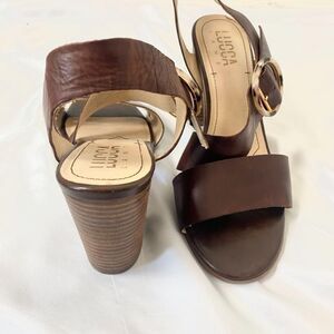Lucca Lane Dark Brown Leather Tortoise Clasp Lace Up Chunky Heel Sandals US 8.5