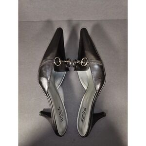BCBG Paris Women 7B Black Leather Horsebit Pointed Toe Mule Kitten Heels Career