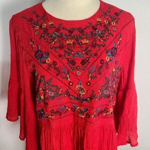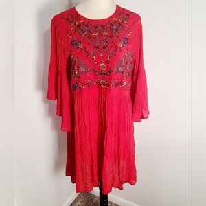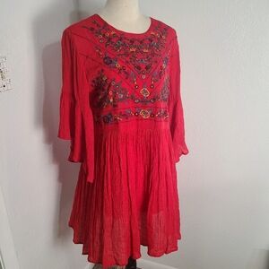 Umgee Red Embroidered Babydoll Bliss Bohemian Dress with Bell Sleeves Size Large