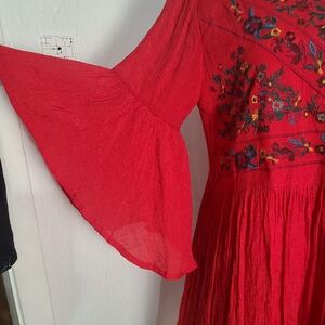 * Beautiful candy apple red boho dress with intricate floral embroidery featuring flowy 3/4 bell sleeves and a relaxed fit