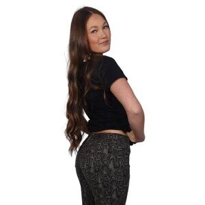 Details: Black cotton tee, rhinestone galloping horse graphic, "Mustang Girl" script detail, crew neckline, short sleeves, broken-in feel.