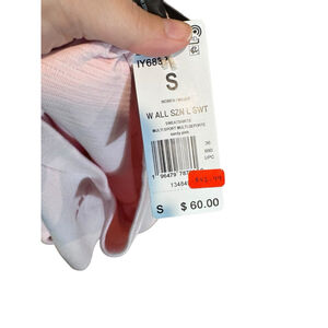 This is a new with tags Adidas "W ALL SZN L SWT" sweatshirt in size S. The sweatshirt is a sandy pink color and features a subtle, embossed Adidas logo on the chest. The material has a horizontal ribbed texture. It has a v-neck and long sleeves with thumb holes. The original price tag indicates a price of $60.00, with a reduced price of $41.99.
