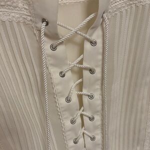 • V-Neck Lace-Up Detailing: The central feature is a striking corset-style lace-up placket finished with braided ties and delicate tassels, adding a modern, adjustable touch.