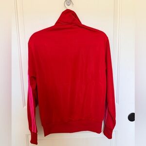 Bold red Adidas jacket with signature stripes. Ideal for active wear or casual style.