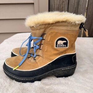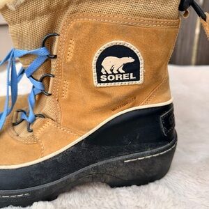 Warm and durable winter boots. Features tan and black design. Cozy lining with blue laces.