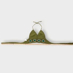 Stylish green crochet halter top with unique floral accents. Perfect for a casual day out or a beach trip.