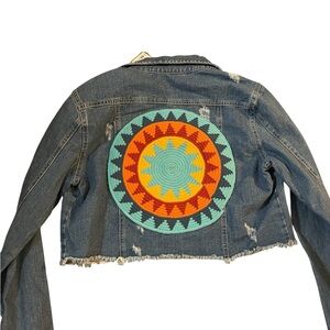 NWT Stylish cropped denim jacket with studded details. Featuring a classic button-up design, silver embellishments and a handmade bohemian style colorful crochet mandala applique on the back.