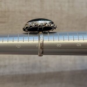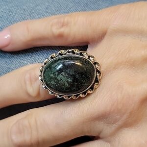 This vintage style ring features a stunning deep green aventurine stone with tiny mica inclusions that shimmer throughout, set in a stamped 925 silver band.