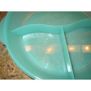 The Tupperware 3284C-1 Crystal Wave Microwave Divided Dish Bowl & Lid is a large, round storage container set with 3 compartments. It features a snap-on lid and is made of plastic in an aqua color. The set includes a lid and is microwaveable, making it a convenient and practical item for organizing your kitchen. With a 10" diameter, this Tupperware product is ideal for adult use and is an original licensed reproduction.