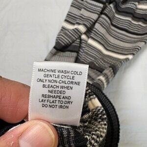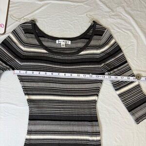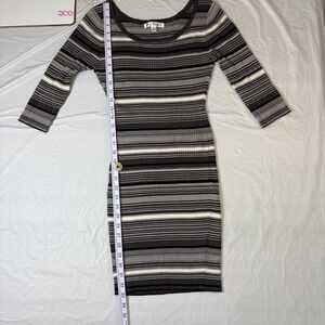 Ribbed knit bodycon dress features a classic horizontal stripe pattern in neutral tones of black, grey, and white. This versatile piece is designed with a flattering scoop neckline and three-quarter length sleeves, offering a slim fit that contours to the body. The soft, stretchy rayon-blend fabric ensures comfort while maintaining a sleek silhouette, making it an ideal choice for transitioning from day to night.