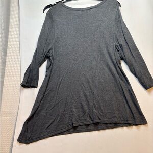 Charcoal asymmetrical vs V-neck top with 3/4 sleeves. Ideal for casual outings. Soft and comfortable fabric.