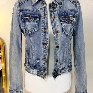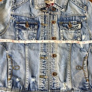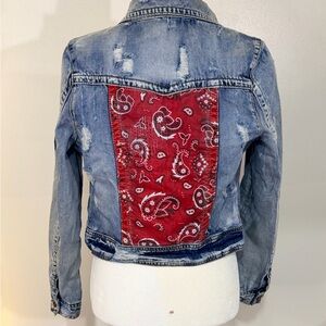 Distressed jean jacket with red bandana backing. This jacket is so cute! Embroidered detail around pockets. Size M, but runs a little small. EUC!! I have too many denim jackets and have to downsize.