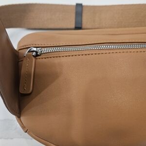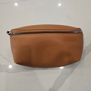 The MONOS Metro Sling Fanny Pack is a versatile crossbody body bag made of vegan leather in a solid light auburn orange color. It features a zip closure and a sturdy nylon lining in a matching light auburn orange shade. The bag is designed with a sling style, making it easy to carry on your body with its adjustable strap. The silver hardware adds a touch of elegance to the overall stylish design. Perfect for both men and women, this purse comes with a key chain and original dust bag as accessories, making it a must-have for any fashion-forward individual.