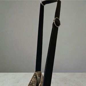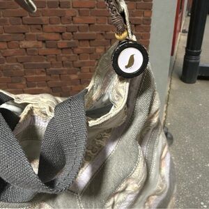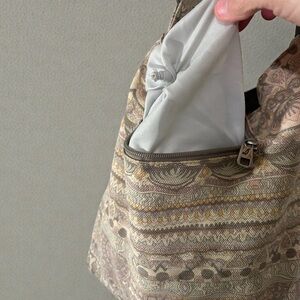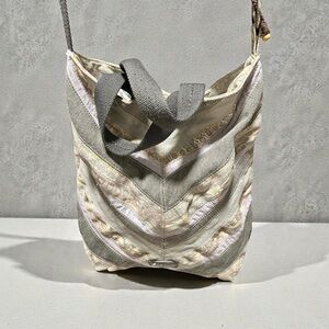 Discover elegance with this versatile crossbody bag, perfect for any outing. Its stylish design offers both fashion and practicality. Has handle and adjustable crossbody strap, callouts are front pocket inside is tied, presumably a hole, and tiny pen marks inside corner. Exterior looks great, no stains, rips or tears. Bag has been washed, really nice hobo bag.